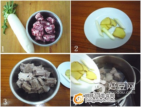 做法:1-2;准备食材:白萝卜排骨、葱段、姜片。